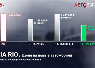 Если «прогуляться» по официальным сайтам дилеров Армении, Казахстана и Белоруссии, то можно увидеть, что цены на одну и ту же модель могут в самом деле сильно отличаться. Взять, к примеру, Kia Rio — самую востребованную иномарку в России. Если отечественные дилеры просят за «бюджетный» седан как минимум 1,5 млн. рублей, то в Белоруссии его отдадут за 1 165 000 в пересчете на родную валюту, в Армении — за 900 000, а в Казахстане — за 1 435 000.